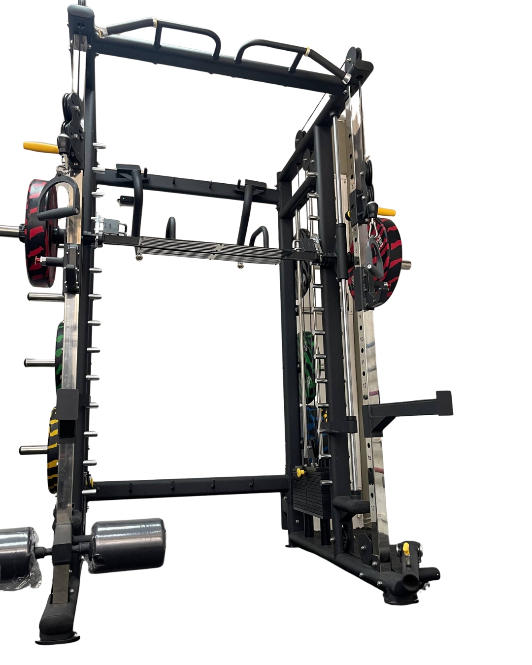 Sistema Smith Integrado de Suavidad Superior: Experimenta movimientos guiados y seguros para sentadillas, press de banca y hombros, con rodamientos de alta precisión que garantizan una trayectoria fluida y sin fricción. Incluye múltiples puntos de bloqueo para máxima seguridad.