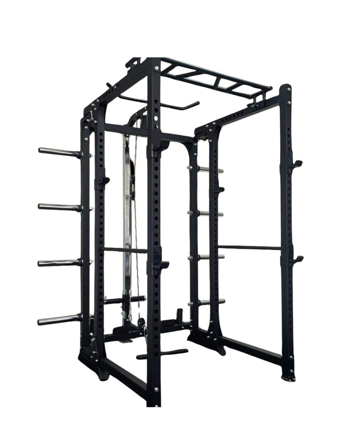 Versatilidad Sin Límites: Con una jaula de sentadillas, power rack, agarres para dominadas con múltiples posiciones, y un sistema de poleas funcional, puedes trabajar cada grupo muscular de tu cuerpo.